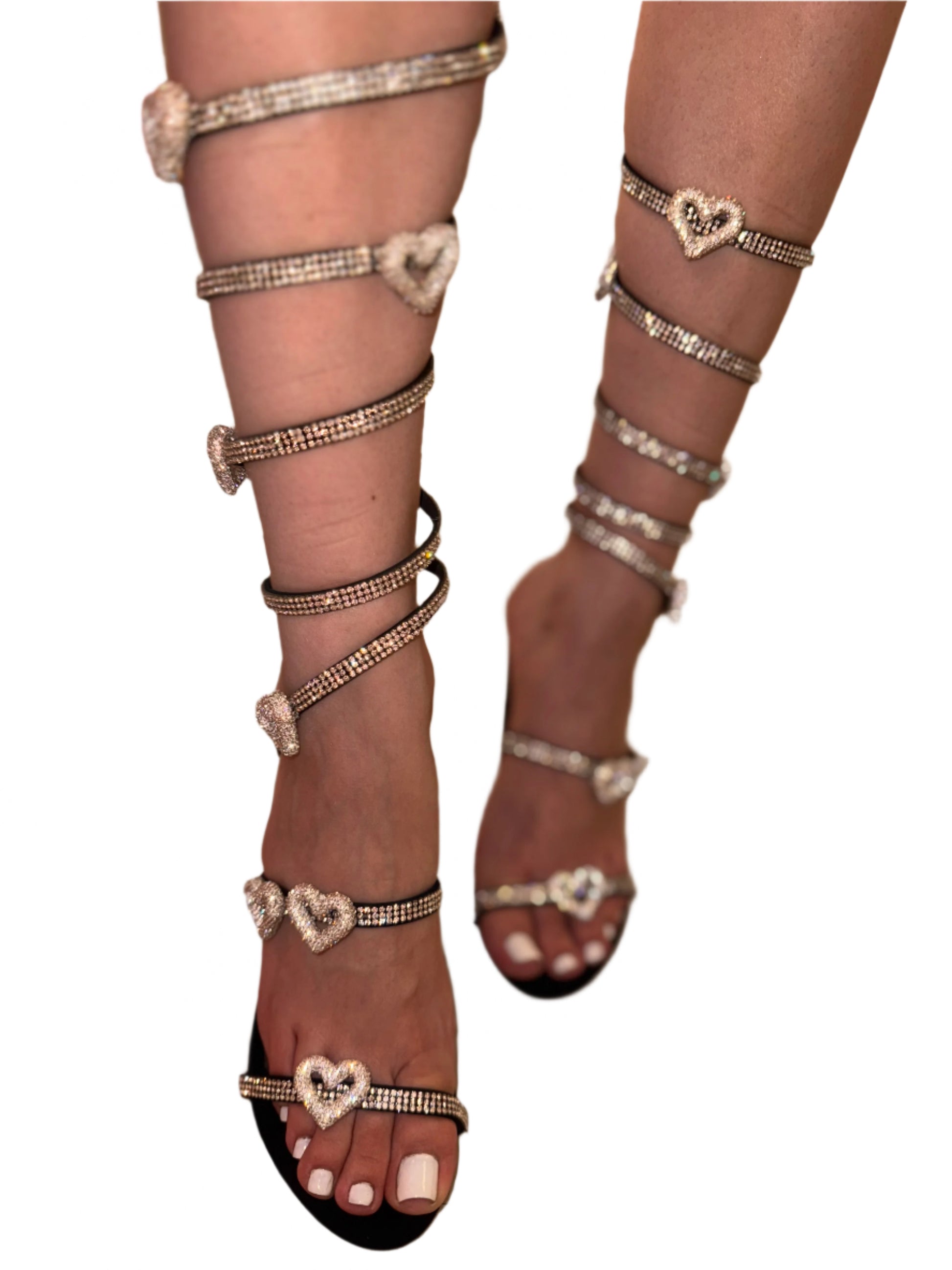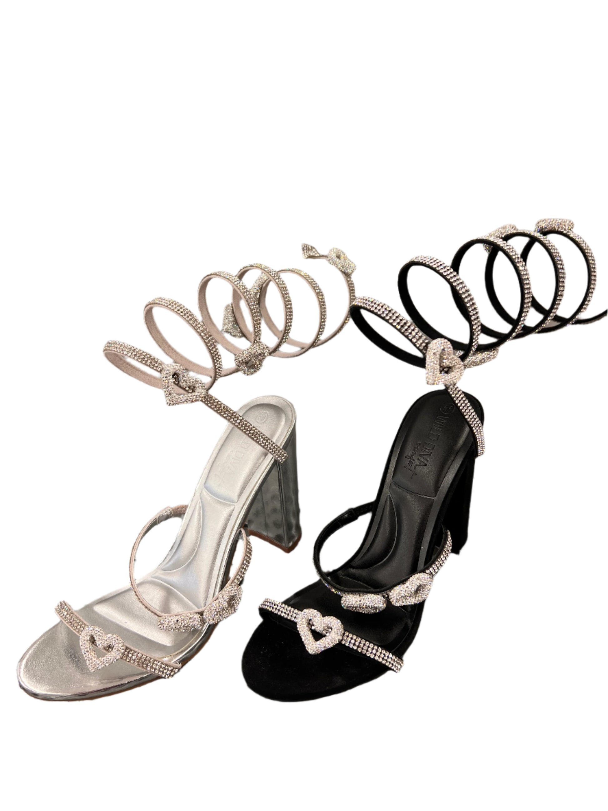 Elevate your style with these statement-making Strappy Rhinestone Block Heels, featuring a stunning rhinestone spiral heel adorned with a heart detail. The perfect combination of glam and romance, these heels are sure to turn heads. Step out in confidence and add a touch of sparkle to any outfit.